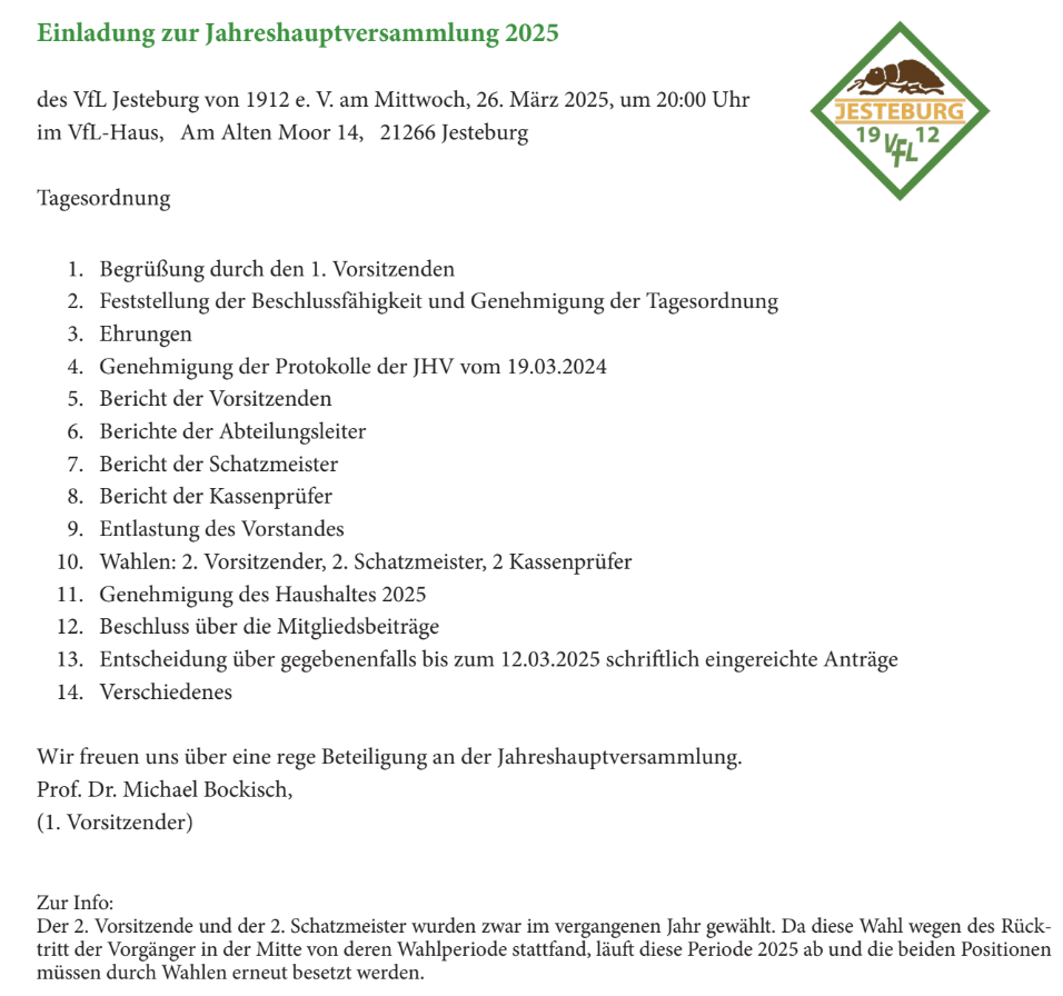 Jahreshauptversammlung am 26. März 2025 um 20:00 Uhr im VfL-Haus