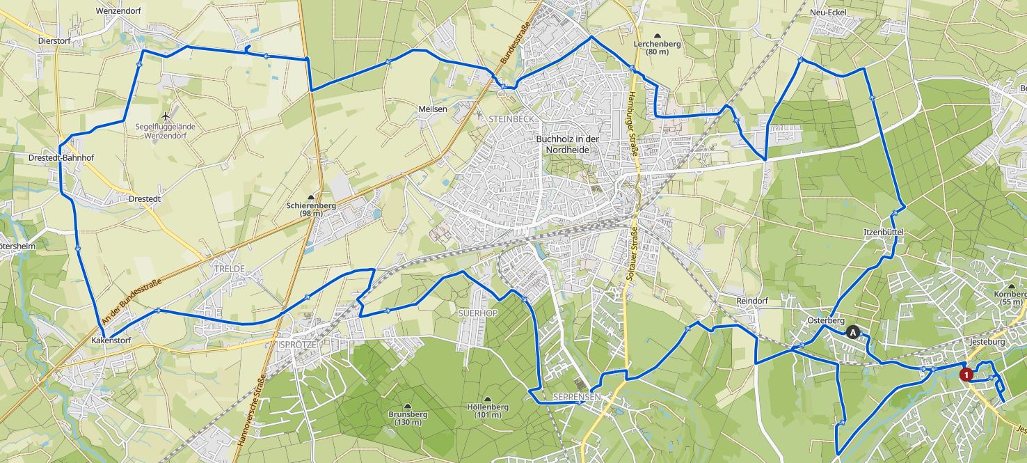Letztendlich haben wir auch das gemeistert und an der Eisenbahnüberquerung auf dem Osterberg trennten wir uns von Sandra. Jürgen wollte über den Totenweg nach Itzenbüttel und dann nach Hause. Erich, Maja und ich (Norbert) sind auf dem Osterberg zu Hause.